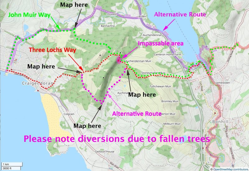 Work to clear fallen trees and create a new pathway through the forest where "Impassable Area" is marked on the map is ongoing. This affects all Three Lochs Way and John Muir Way users. Scottish Woodlands are working to upgrade the roads and we hope the eventual path will be a significant improvement. The National Park and Scottish Woodlands consider that this area is now passable but we are not convinced of that so we will leave this diversion information available for a while yet until we see improvements to the path at this point. Diversion signage as indicated on this map has been removed. Please observe any advice from contractors working in the area as trees are still being extracted and heavy machinery present. The diversion is still a great route with superb views over the Firth of Clyde and is only 1 kilometre longer.